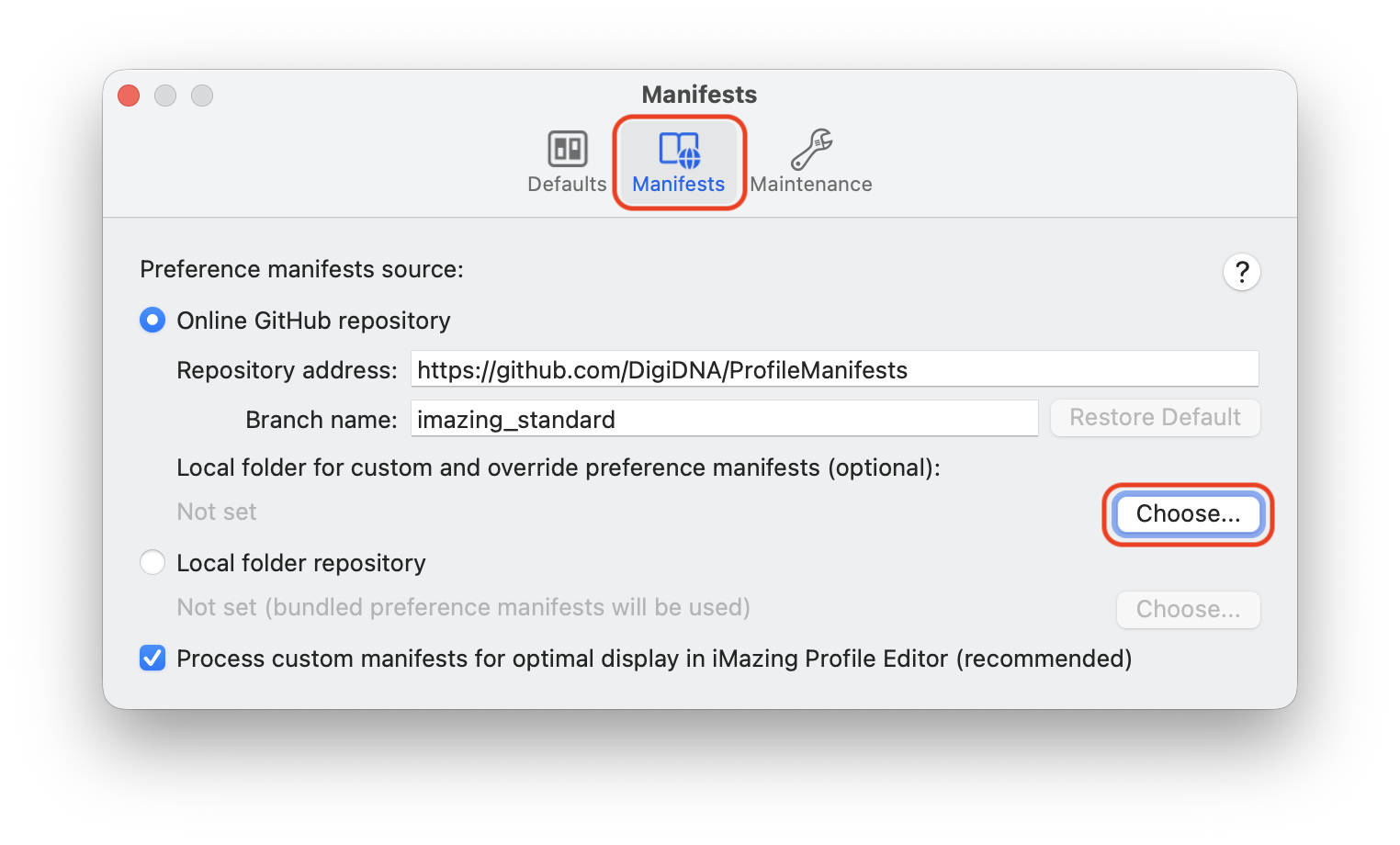 - Go to Manifests → Local folder for custom and override preference manifests → Choose…
